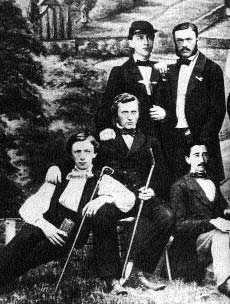 1857 Arnold Janssen (centre) entouré de compagnons. Il étudia les sciences naturelles, la philosophie et la théologie à Munster et à Bonn |